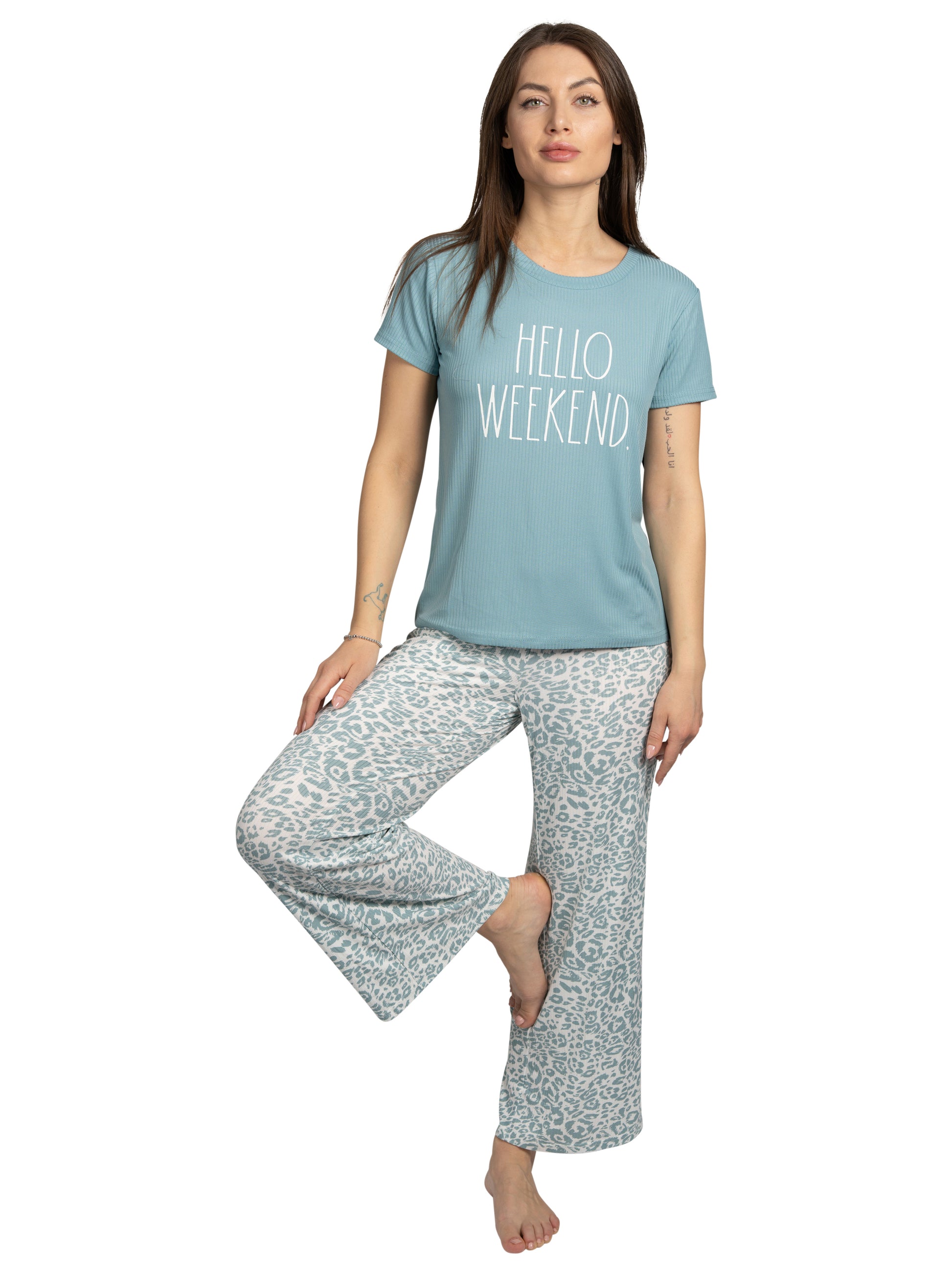 Women's "HELLO WEEKEND" 2-Piece Short Sleeve Top and Wide Leg Ribbed Pants Pajama Set