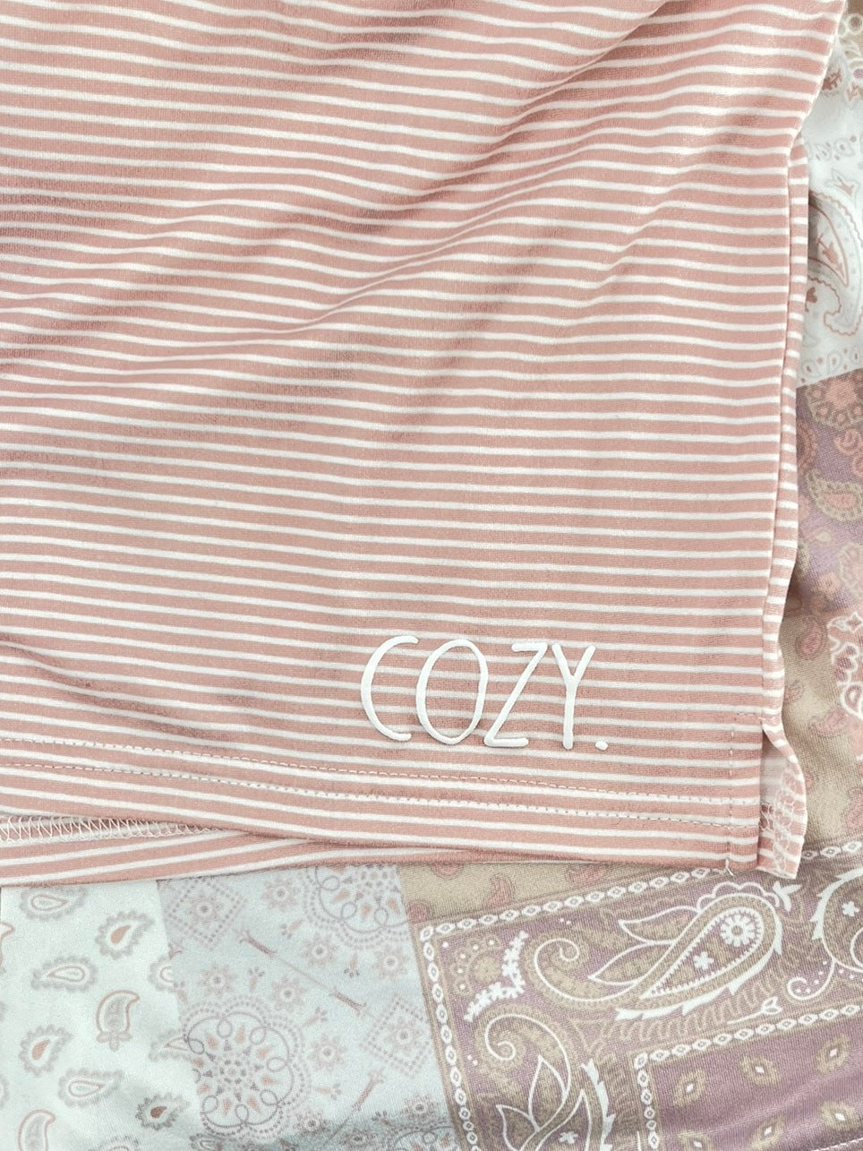 Stay cozy and cute in our drawstring lounge shorts pack of 2! Designed to be soft, stretchy and breathable while relaxing. Each set comes with 1 Pair of Quilted Paisley shorts and 1 Pair of Pink Mini Stripe shorts with small COZY graphic. Perfect for getting cozy on the couch or whipping up a delicious brunch for your crew!
